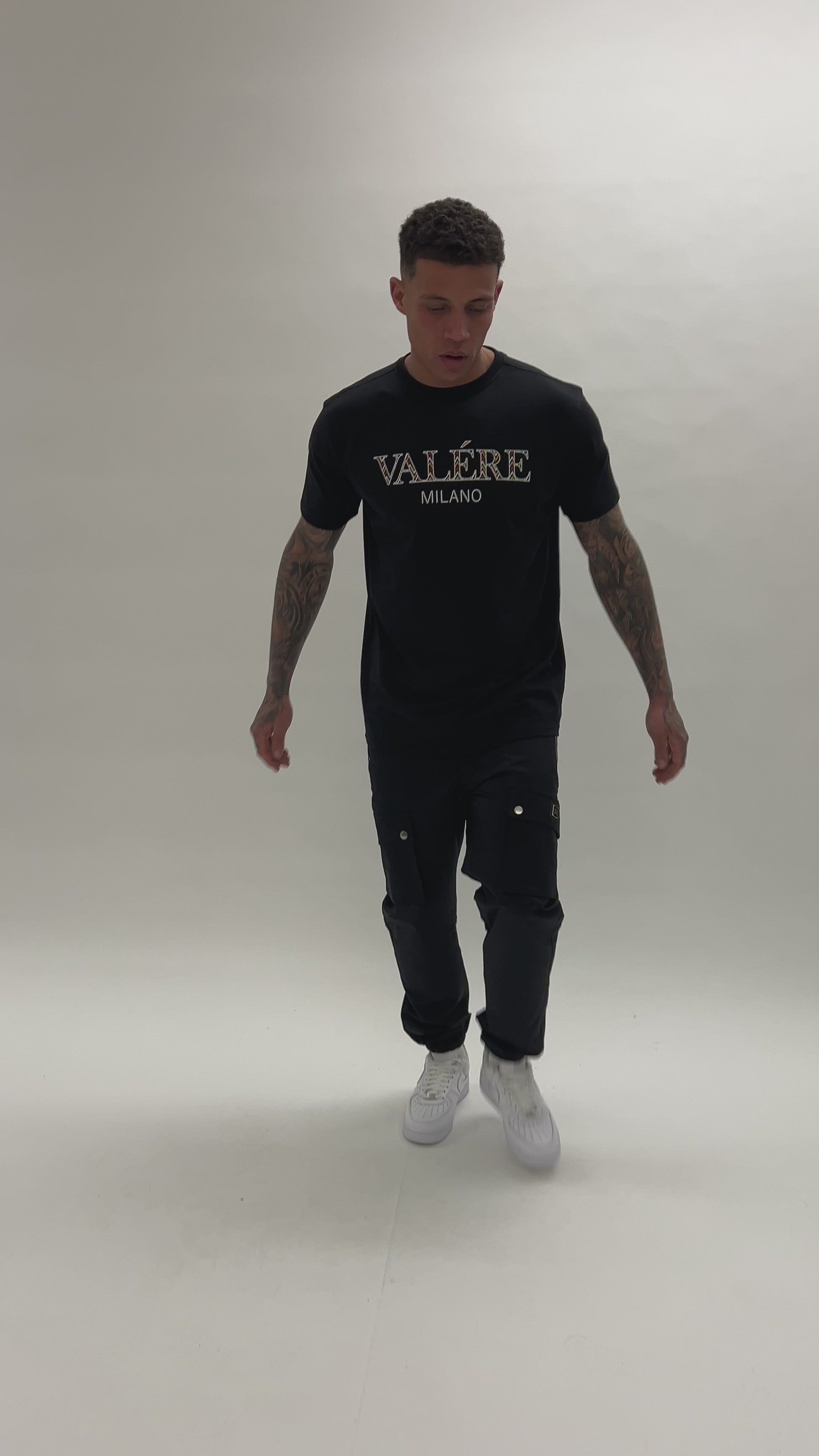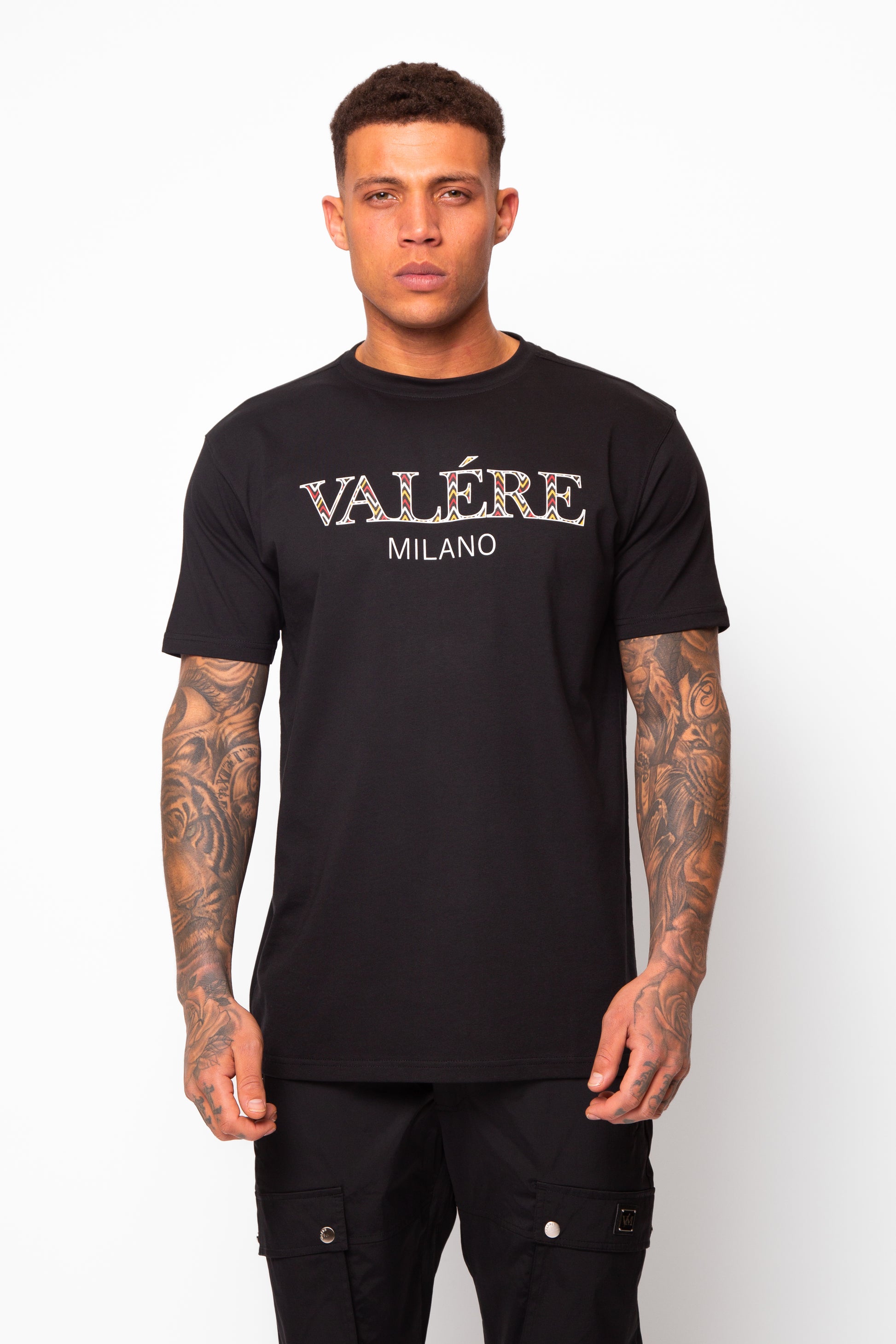 Black tee with flat and high build printed branding
