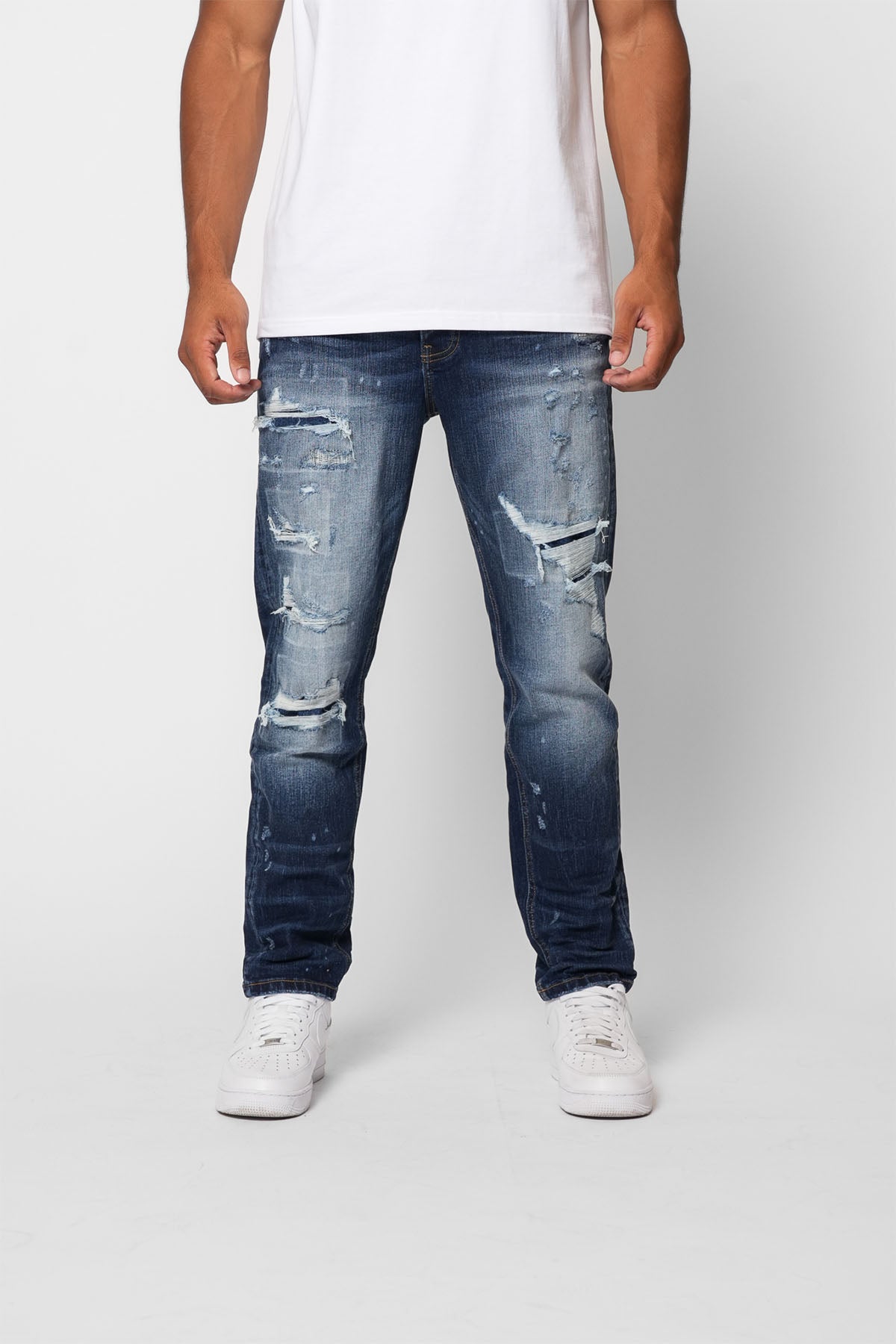 Distressed dark indigo jean