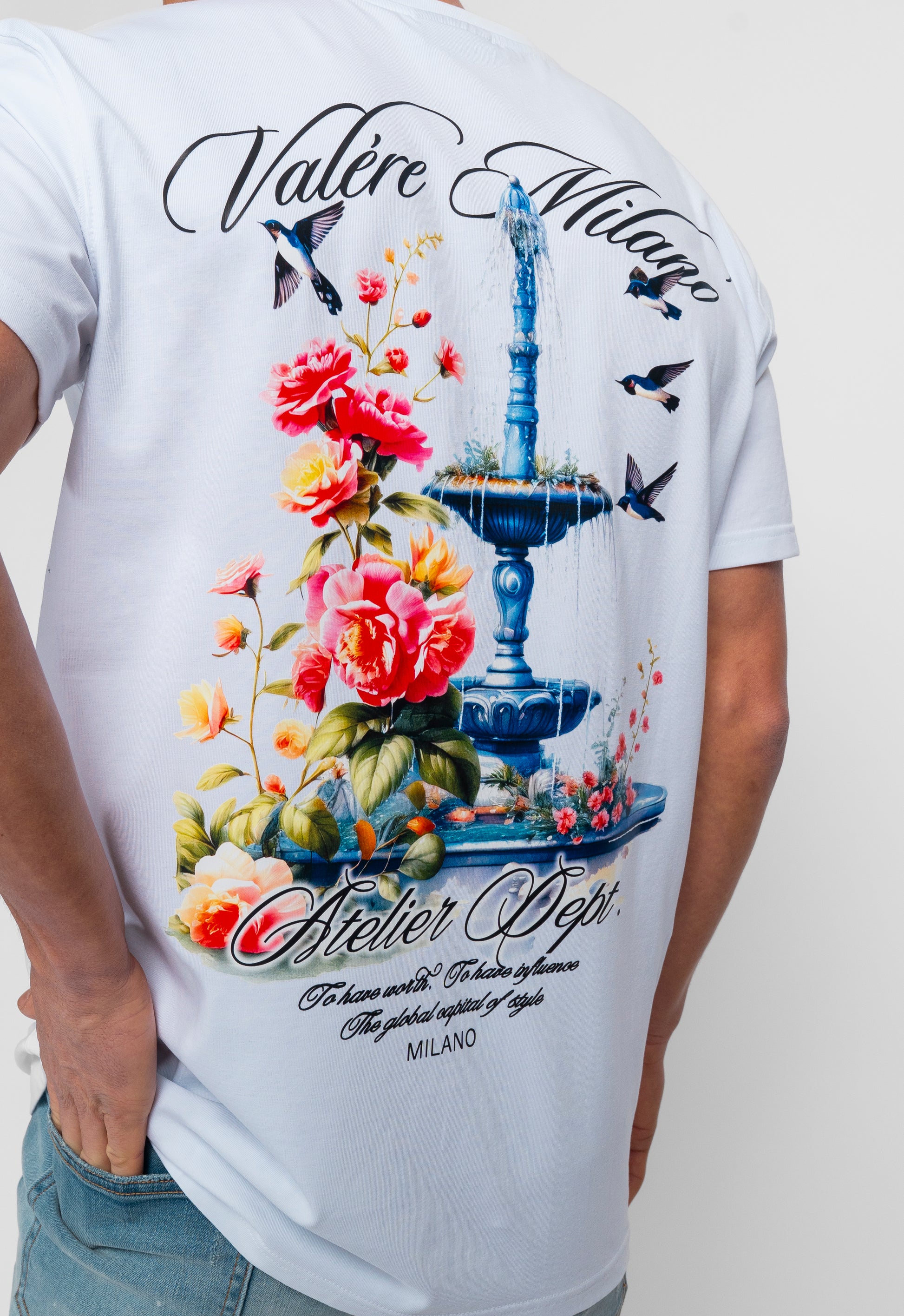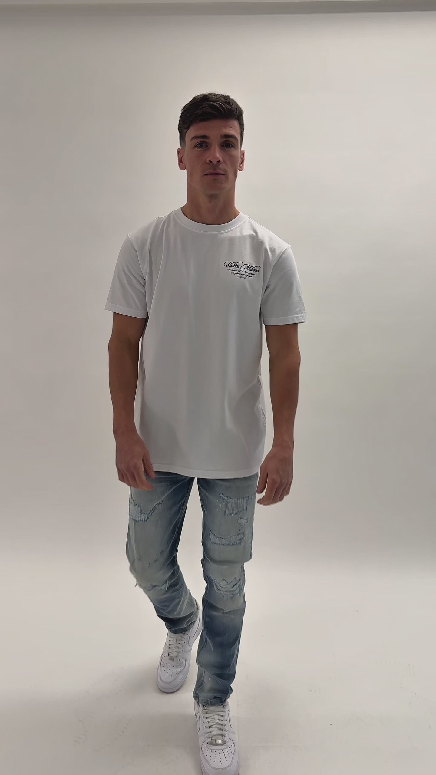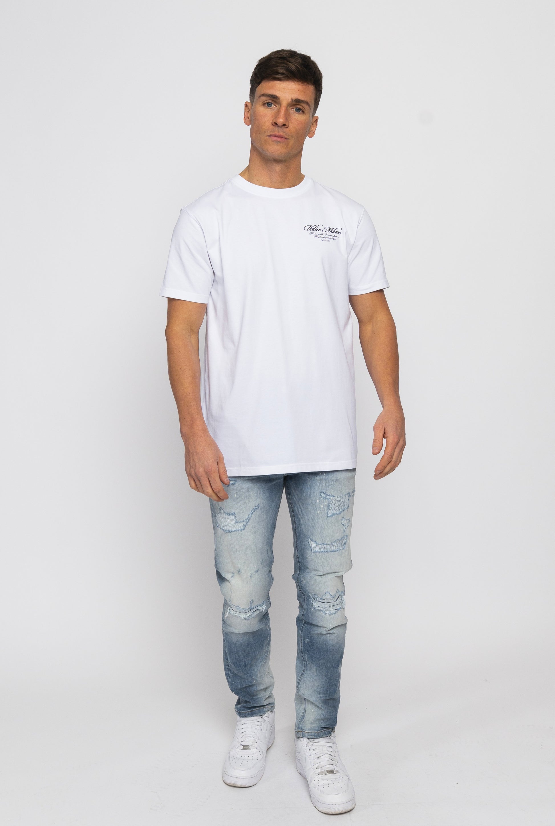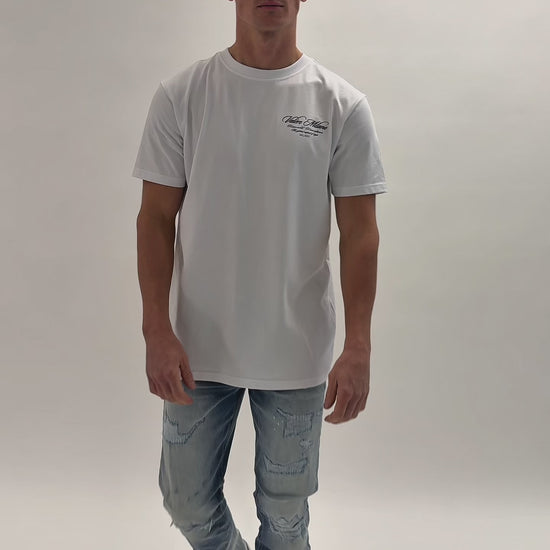 White tee with flat soft touch branded print